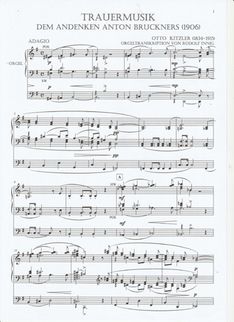 Kitzler's three-part funeral music - In memory of Anton Bruckner (Adagio - Andante con moto - Adagio) does not use direct quotations from Bruckner's symphonic works, but adopts typical stylistic elements of Bruckner's symphonic music: short 'impulse motifs' with their tendency towards sequencing (instead of motivic-thematic work), the advanced alteration harmony (inspired by Wagner) with a preference for fallacious turns in distant third relationships as well as the tendency towards pedal points or general rests, techniques that the gifted improviser on the organ Anton Bruckner had been familiar with since his youth.
